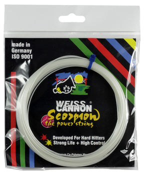 Weiss Cannon Scorpion is a monofilament poly based string constructed using high grade polymers and chemical additives to obtain additional power, control, durability and comfort.